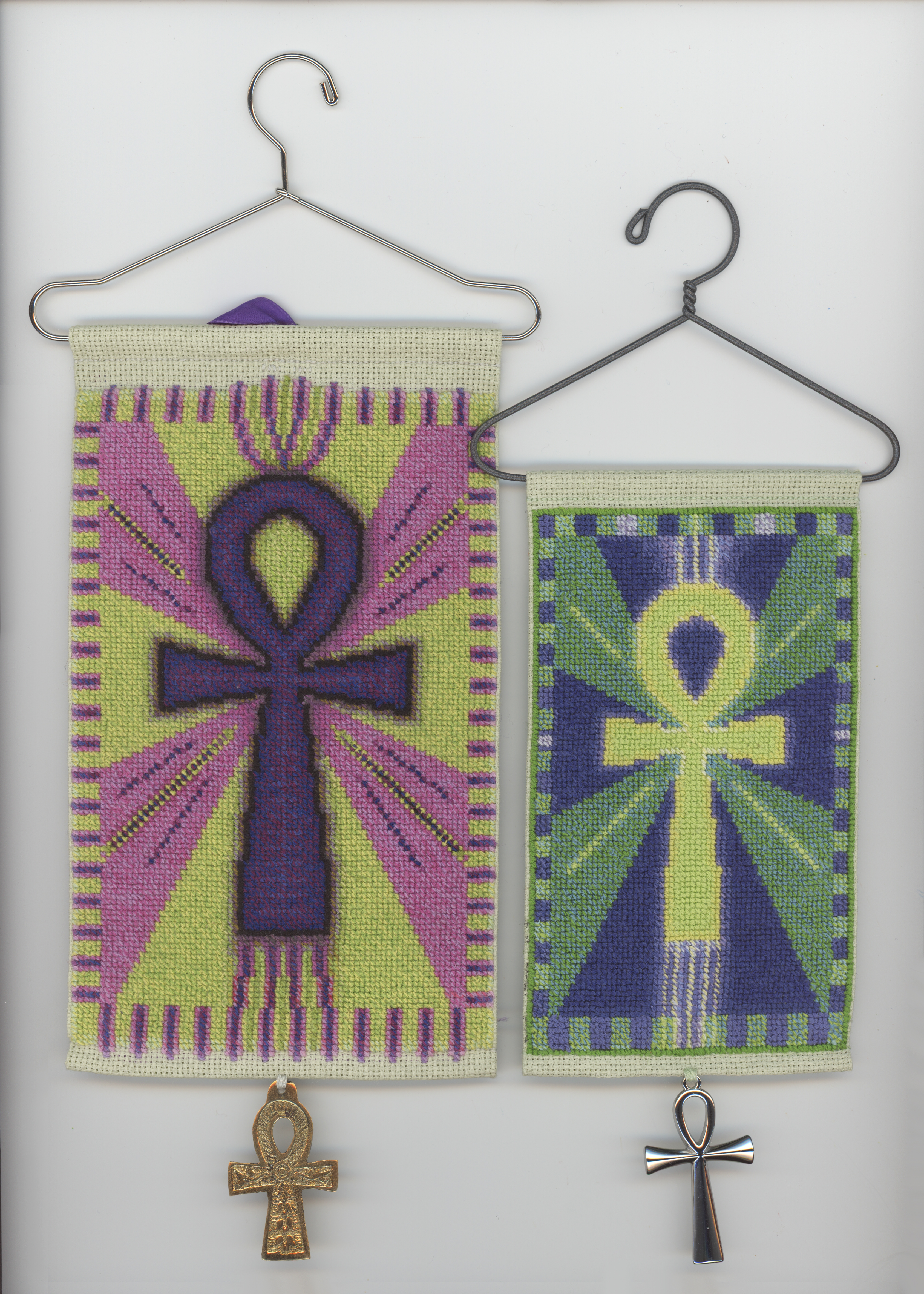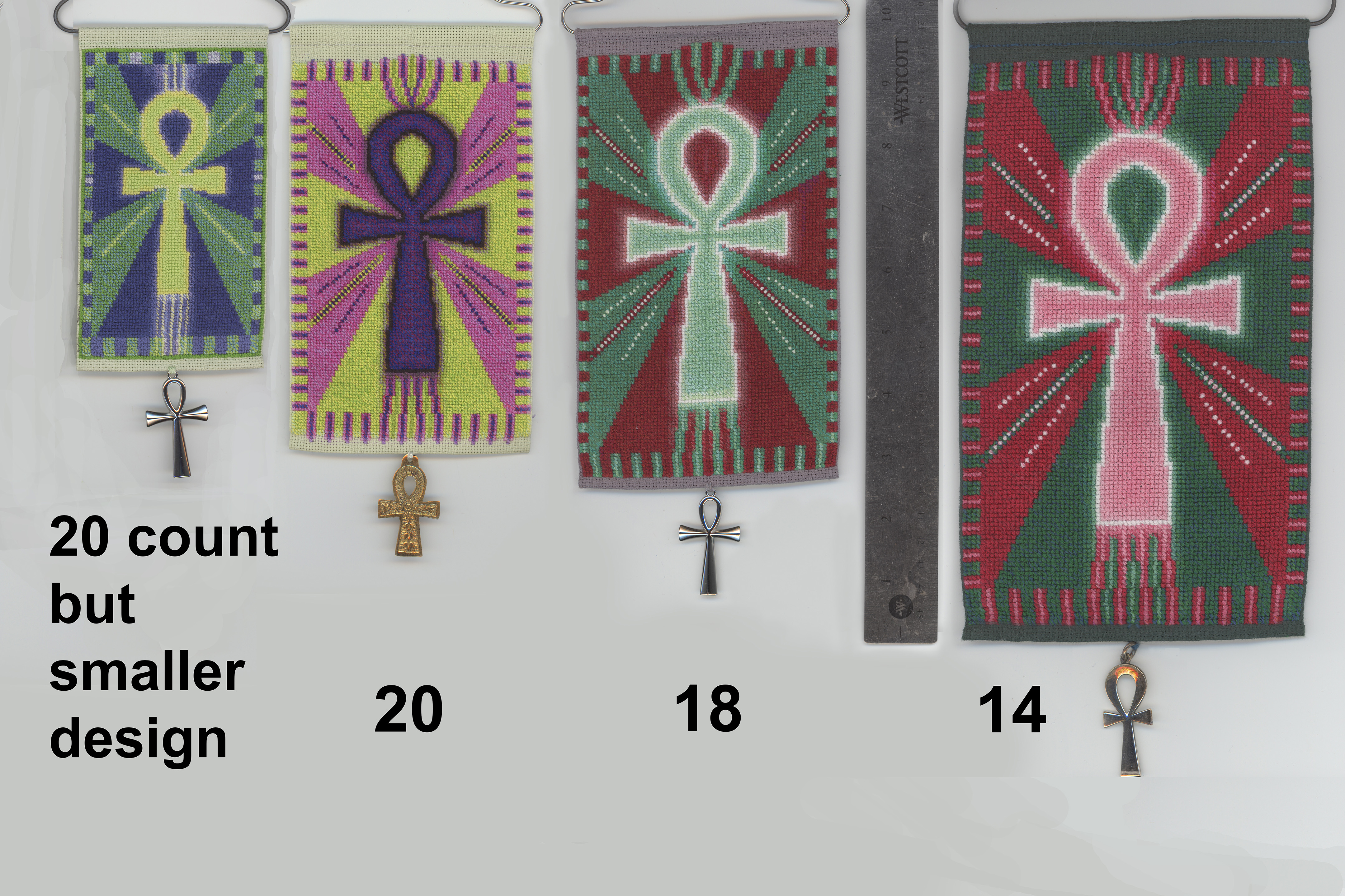 Back to my stitching efforts... I felt the temptation to do one more of the 'radiant ankhs'. The new design challenge was adapting the design to a smaller size. The size changes on the others in the series were done solely by change of stitch count of the aida. This ankh end of 'arm' to end of 'arm' is 35 'pixels' wide, whereas all the others are 47 'pixels' arm to arm. I had to simplify some aspects of the design: