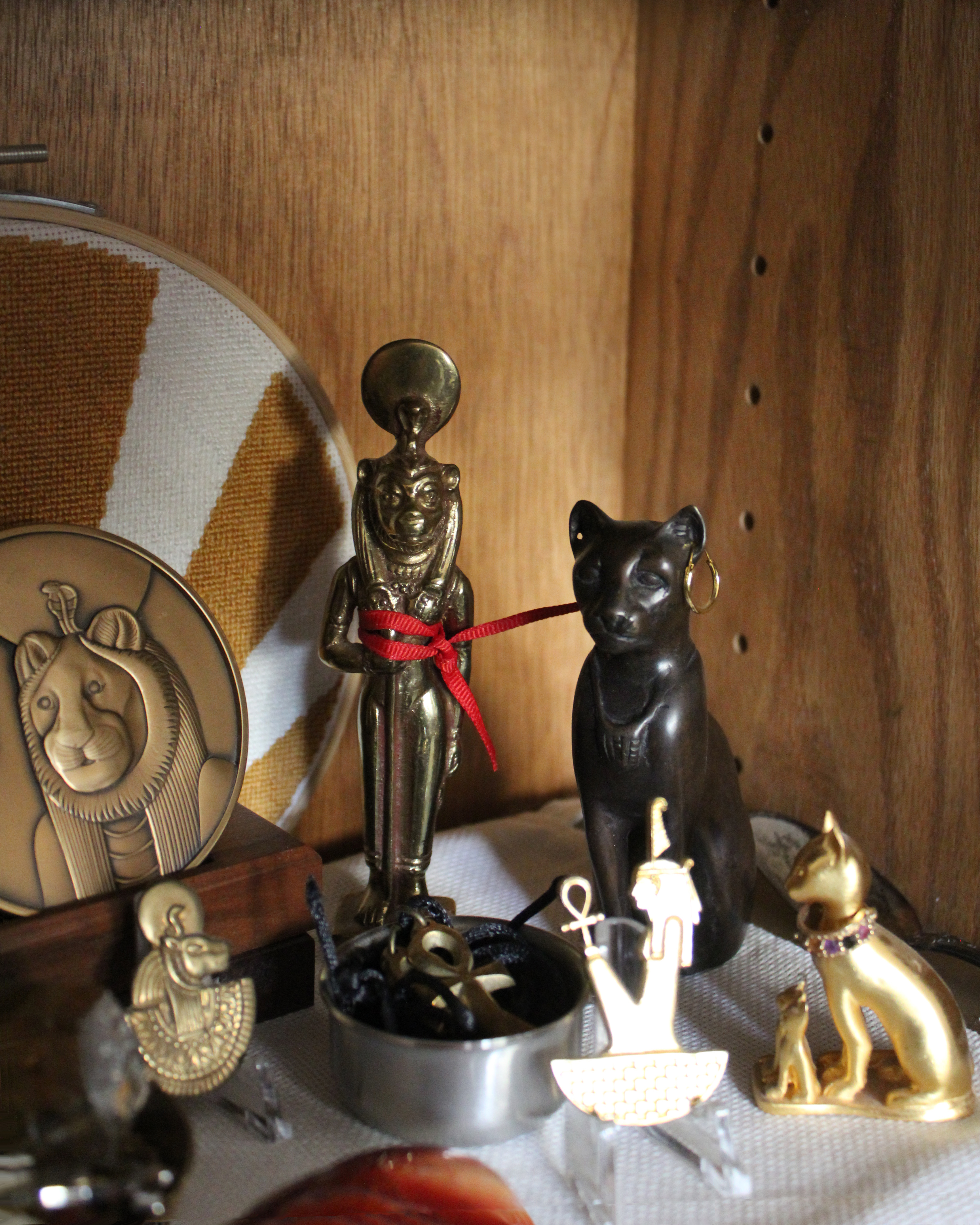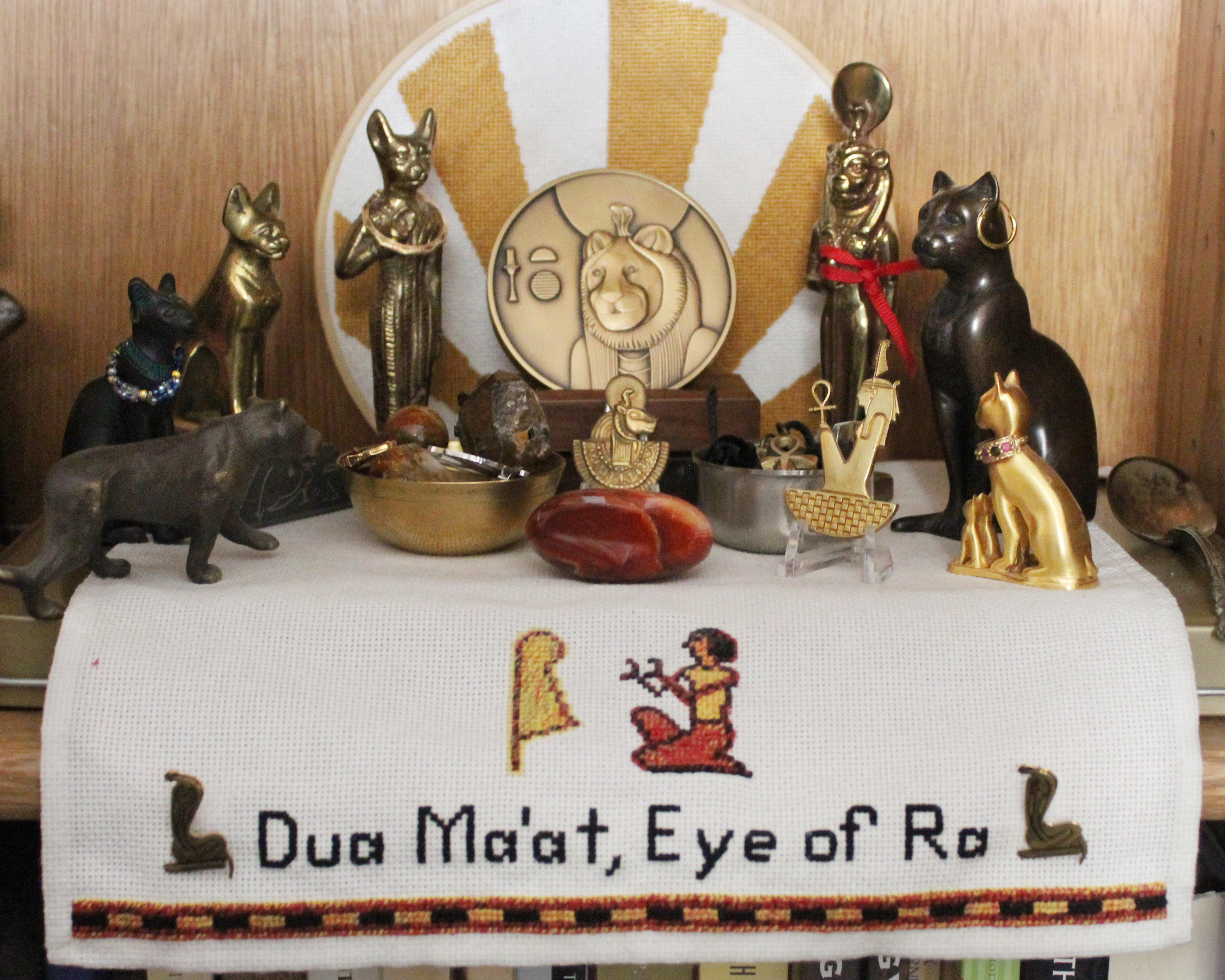 This shrine for the Eye of Ra was first created in 2020, with a simple design. It was moved to a different location in 2022. But over the next four years it kept growing and I don't know how I fit all the things I'd crammed into its little platform. Now a new statue inspired me to a reorganization: