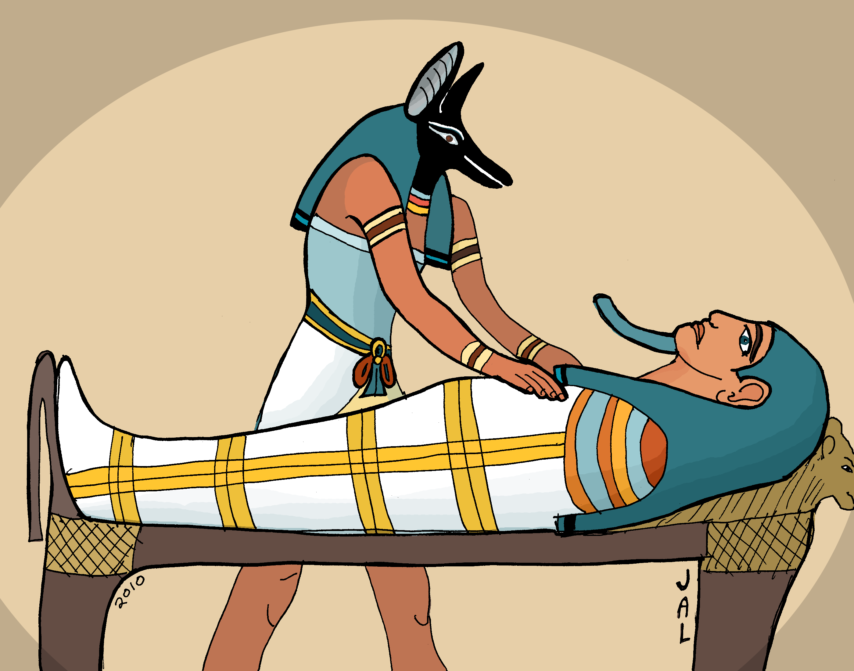 Anubis has an "Isis Knot" around his waist, said to represent the "blood, magic, and power of Isis." (_Ancient Egyptian Magic_, pages 193-194) but I suspect there are other more ancient associations!)