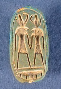 From the GEM site: "The blue enamel seal takes the form of a cartouche representing Seth and Horus holding hands. The two gods with the heads of falcons are wearing the double crown of Upper Egypt and Lower Egypt. They are surmounting the hieroglyphic sign signifying gold. The handle of the seal is the transposition, in faience, of vegetable stalks tied together. The material indicates that it is probably an amulet..."