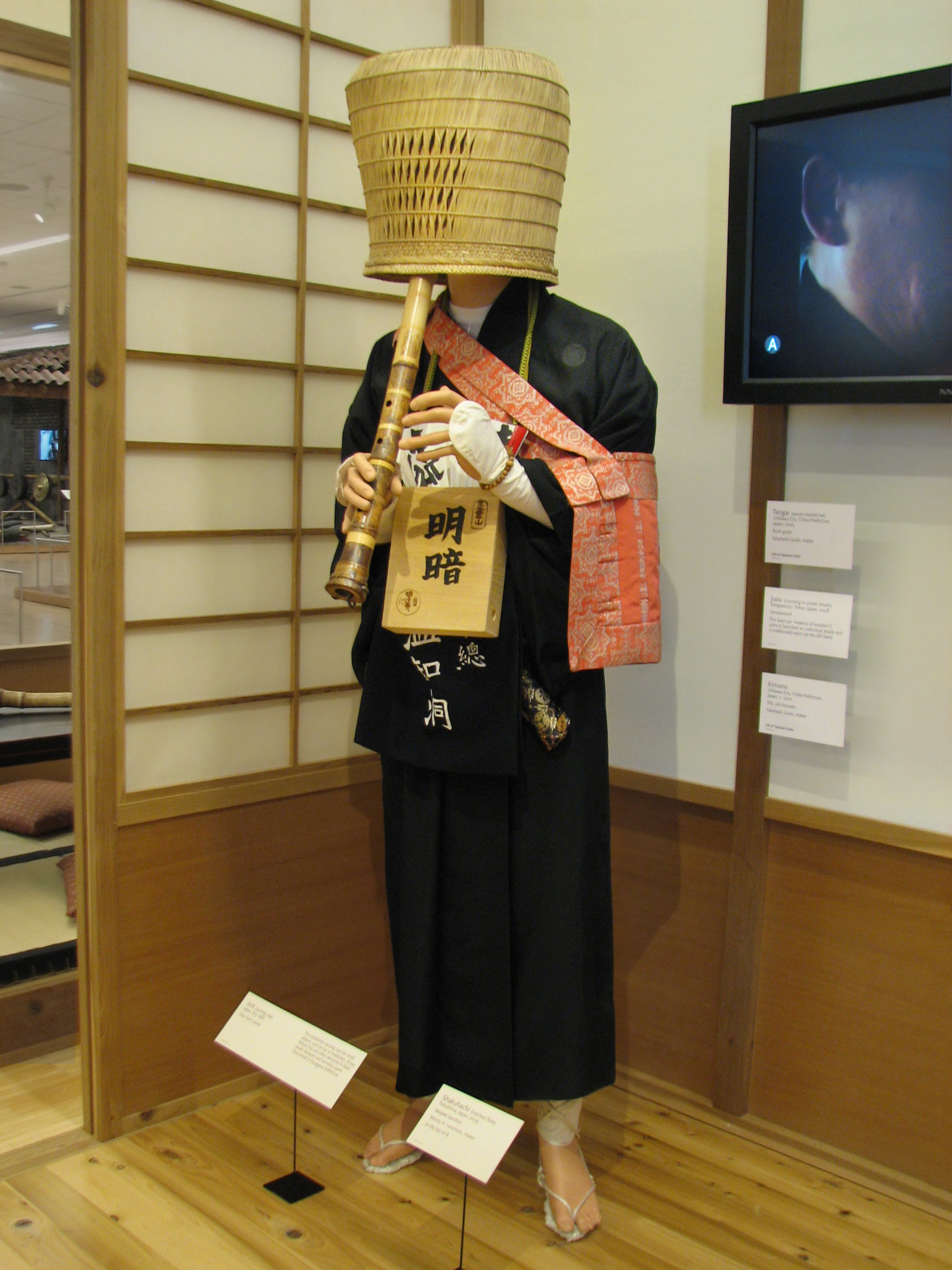 While playing shakuhachi, komuso wore large, woven baskets called tengai over their heads to symbolize their detachment from the material world. In the hands of komuso monks, the shakuhachi became an iconic part of Japanese culture and remains an admired instrument for achieving both musical mastery and spirital enlightenment." (From the info card)