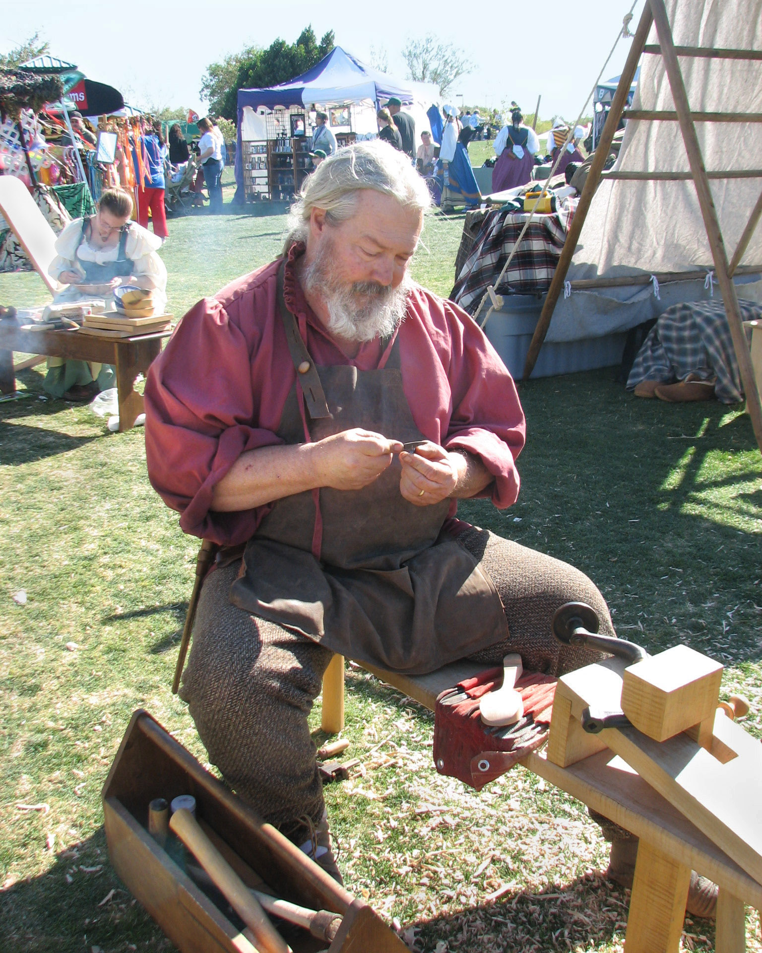 In the picture above, he is sharpening a small tool, which he uses later to bore an opening in a long pole. He's making a tent stand for an exhibitor that will be at the Arizona Renaissance faire next month. (Julia and I went to a couple of those, in 1999 and in 2000.)