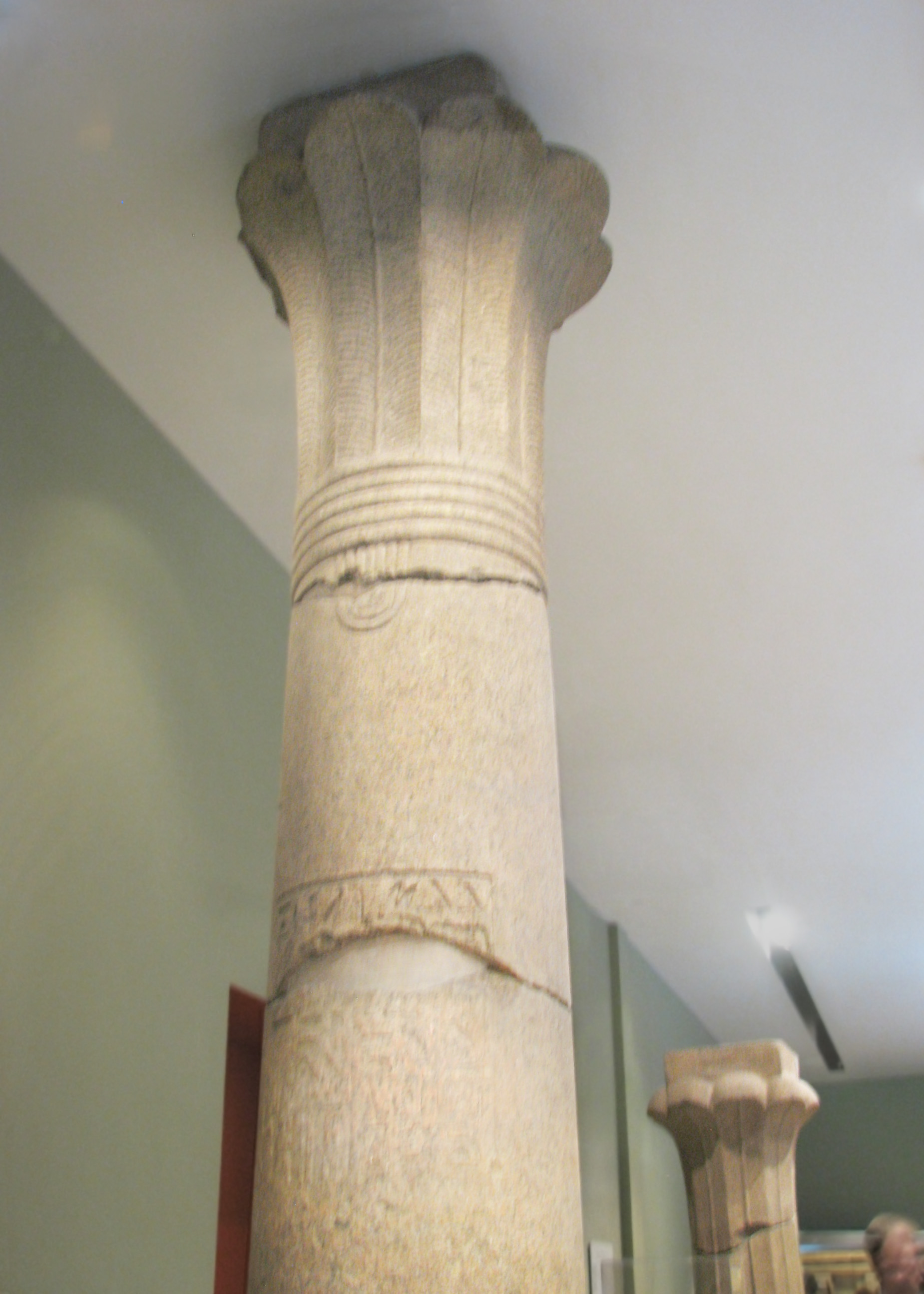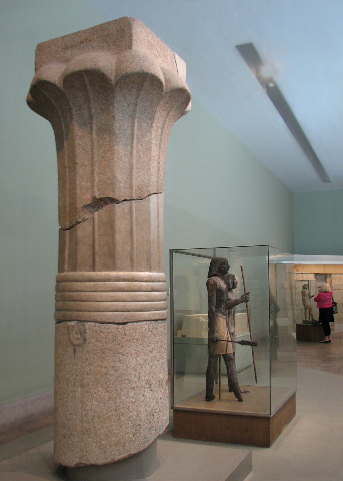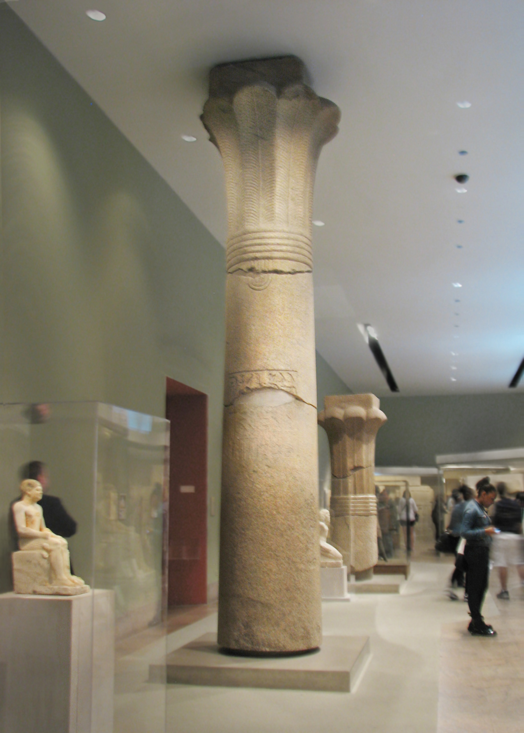 From info card: "This column fragment with a palm-leaf capital is said to be from the pyramid temple of King Unis at Saqqara. Its dimensions differ, however, from those of other columns that belong either to his pyramid temple or to the valley temple." |