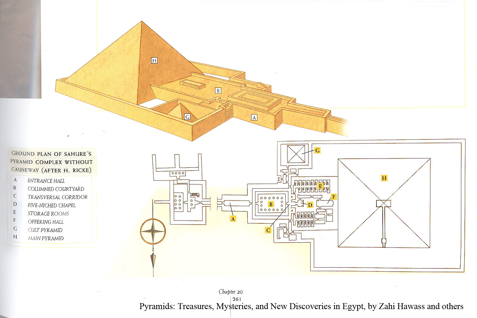 From Museum website: "This massive column is one of sixteen that surrounded an open courtyard in the pyramid temple of the pharaoh Sahure, whose names and epithets are inscribed in the panel. The column is a single block of granite, originally 21 1/2 feet high (6.45 m). The stone was quarried at Aswan and ferried downstream more than five hundred miles to the pyramid site at Abusir. Many elements in pharaonic stone architecture are stylized representations of wood and reed elements that may have existed only in very early structures. The palm column seems to imitate a wooden pole with date-palm fronds lashed to the top with rope. The end of the rope, tucked under the lashings, reappears beneath as a loop." Pyramids: Treasures, Mysteries, and New Discoveries in Egypt, by Zahi Hawass and others, shares a map so we can see where these columns would be, in 'area B' according to the map: |
