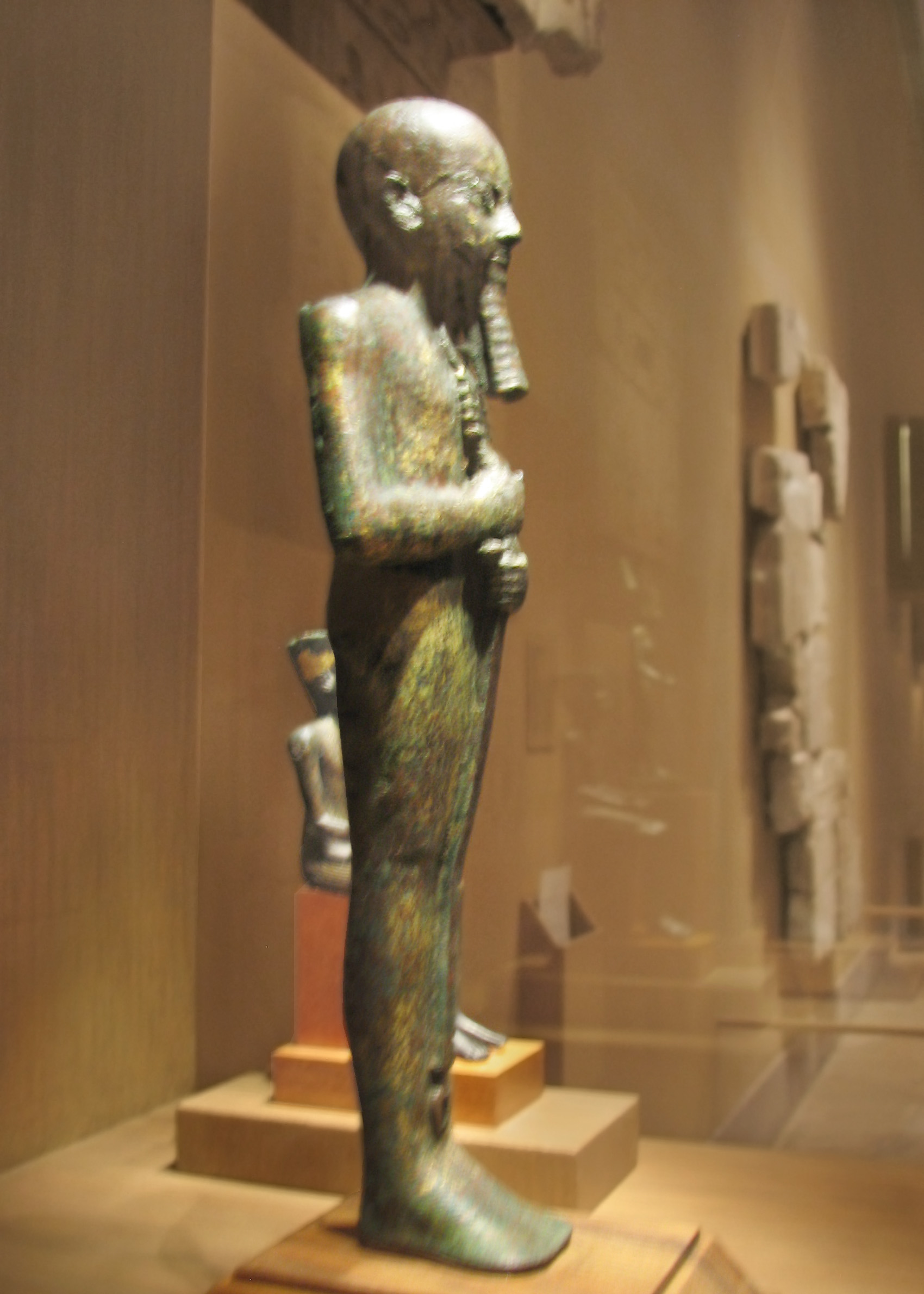 (From Museum website) "The great Egyptian god Ptah was a deity whose many aspects include those of both a creator god and a god who listens to individuals’ prayers. Ptah’s name was commonly accompanied by the epithet Nefer-Her, or “Benevolent of Face,” a description suited to the serene and open features of this particular image. "The statuette is remarkable for its beauty and size, state of preservation, elaborate manufacture provisions, and its demonstrable date to the Third Intermediate Period. The Third Intermediate Period was, as its name suggests, essentially a sort of Egyptian Middle Ages: political power was fractured, but temples became magnets for art and invention expressed in the metal images of gods and temple functionaries. They were large and finely executed by diverse and inventive means. "A statue like this would have been housed in a wooden shrine; when the shrine doors were open, the statue might have been the recipient of offerings and incense or the focus of ritual chants and music. When its period of use was over, the still sacred statuette would be deposited in a cache within the temple walls."
