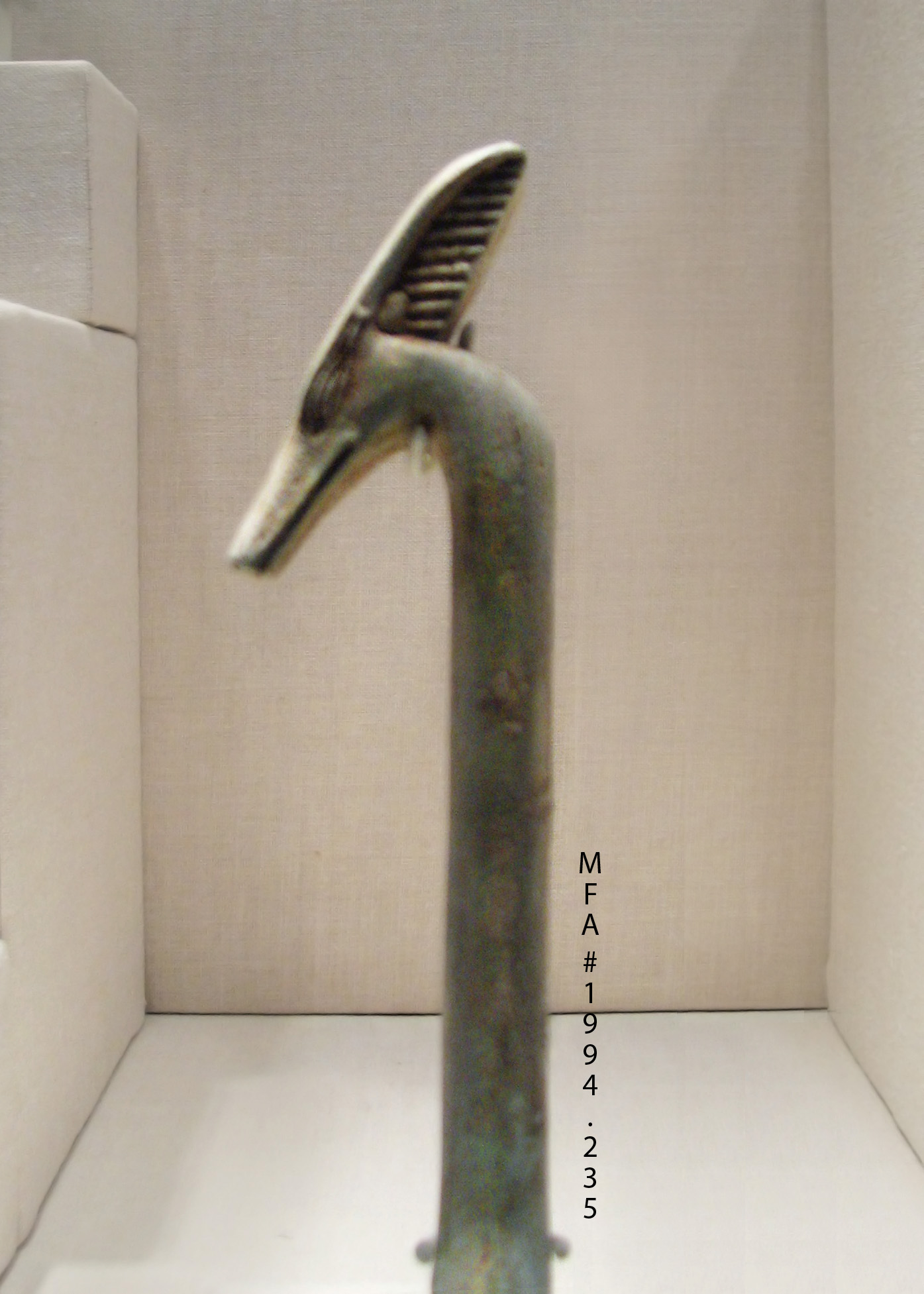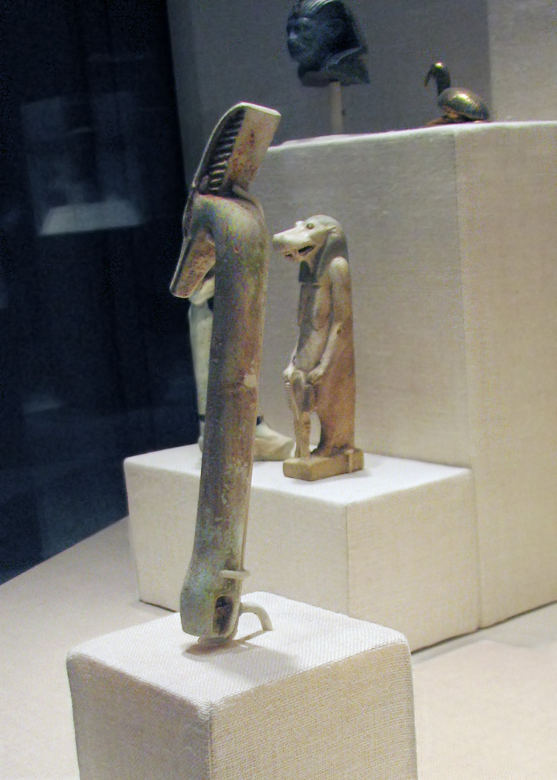 "Gardiner holds that the head of these sceptres is probably the head of the Seth-animal. Wainwright drew attention to the special relation between these divine scepters and the god Seth. The nome sign of Oxyrhynchus, that was one of the nomes of Seth, consists of two was-sceptres, and an enormous was-sceptre was found in the temple of Seth at Ombos. Besides their function as sceptre in the hand of gods, was-sceptres serve to hold up the sky. As supporter of the sky Seth is appealed to in a prayer by Rameses II." (page 90) |