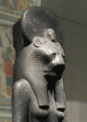"It is thought that the black granite statues of Sekhmet, now scattered in museums throughout the world, once formed a huge monumental litany in stone. Jean Yoyotte has estimated that over seven hundred of them must have once stood in the now ruined funerary temple of Amenhotep III, on the west bank at Thebes, each dedicated to a particular day of the year. Alternately seated and standing, each lioness figure is crowned with a solar disk and fiery cobra snake, and holds either an Ankh-sign of life, or a papyrus sceptre, to symbolize the life-giving greenness of her propitiated state." |