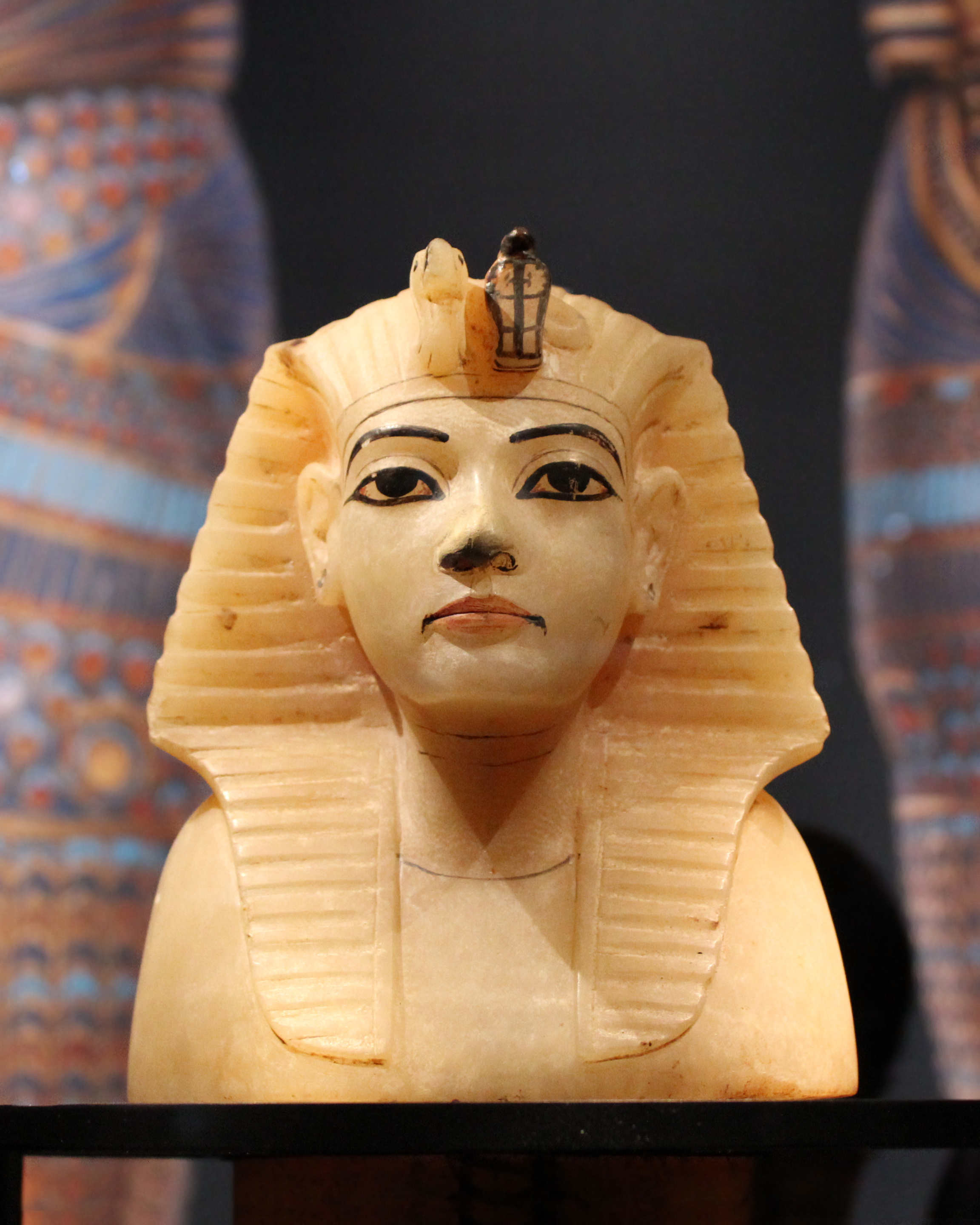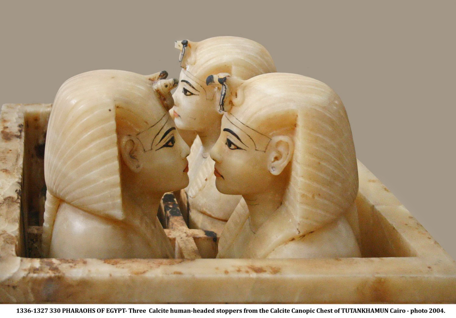 ![]() Calcite Stopper for Canopic Jar, King's Head: NW Calcite (Alabaster) Height 24cm (9.44 inches) Reign of Tutankhamun 1336-1326 BCE Grand Egyptian Museum #347-C "There were four of these finely modeled calcite stoppers. A black symbol painted on the shoulder of each head identifies the coffinette to which it belongs." (Info card) The four coffinettes go into a calcite chest, which has cavities carved out to contain them. |