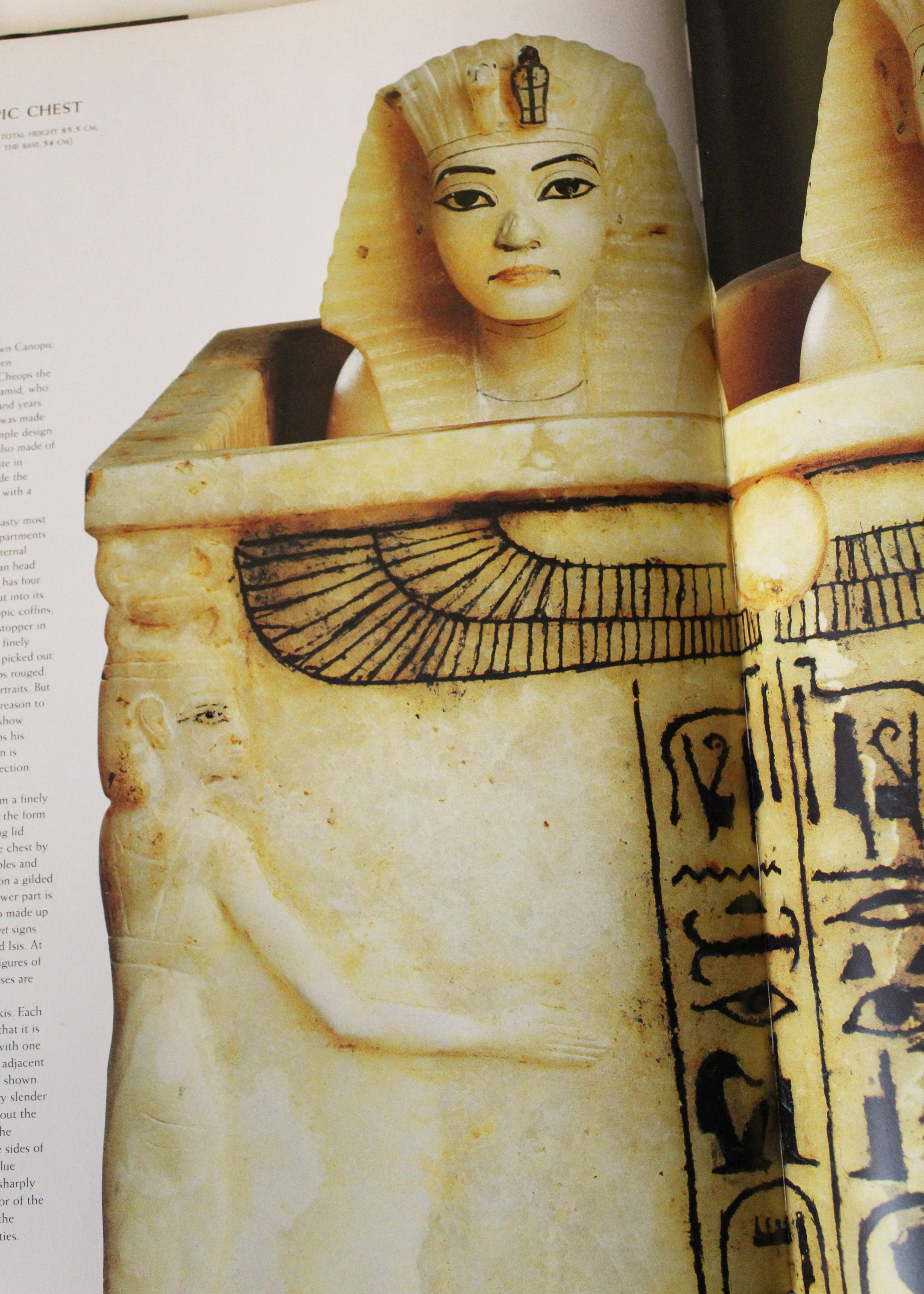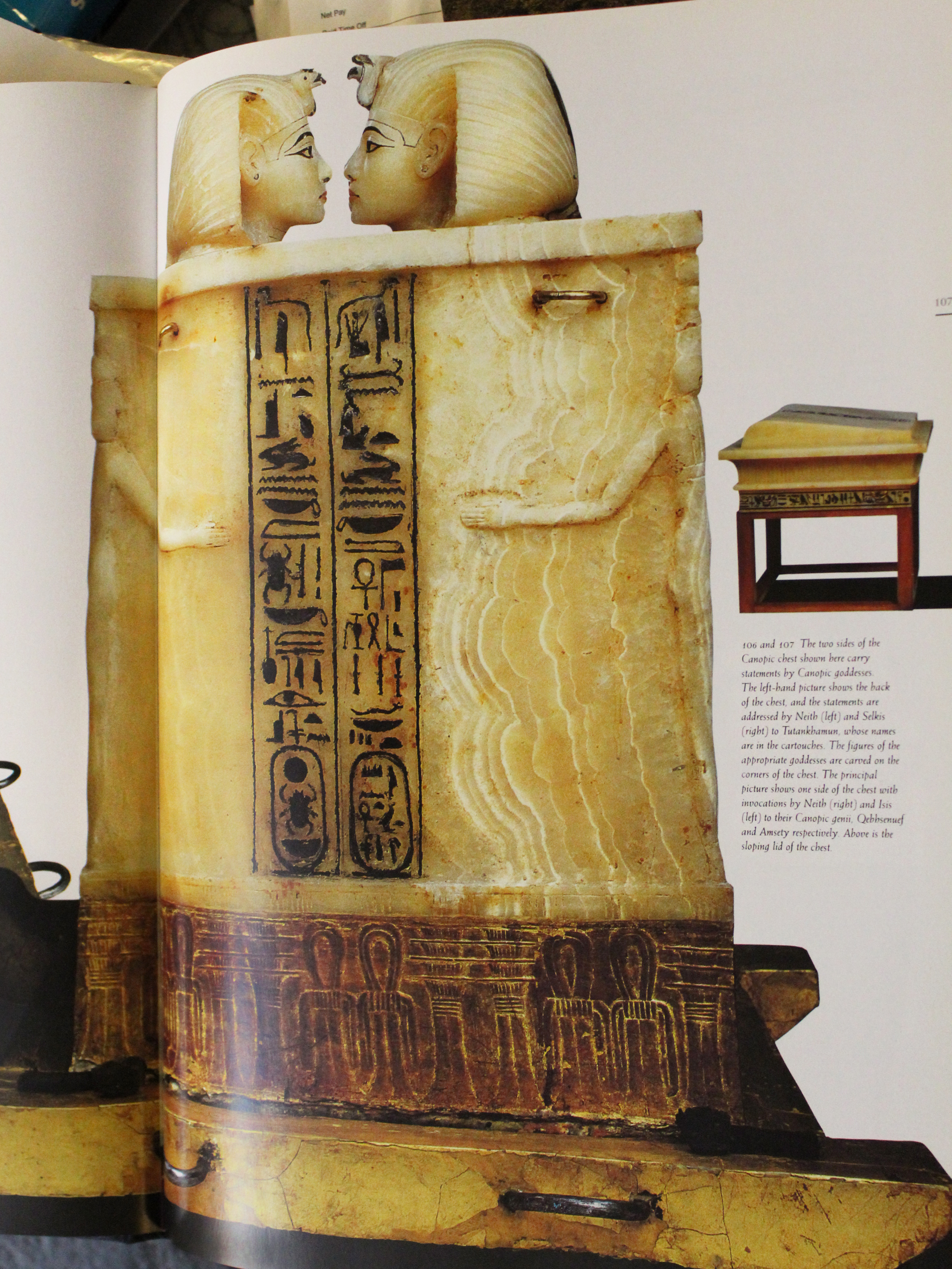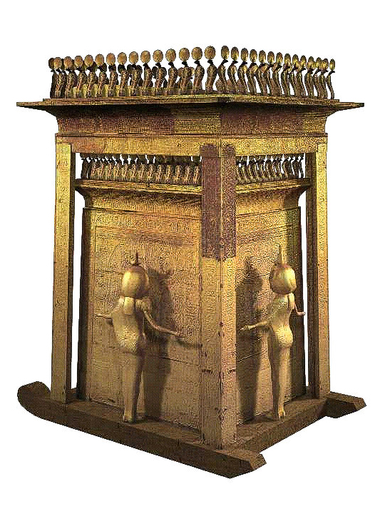 ![]() This photo by A. DeLuca shows the chest, with the four heads facing each other. (T.G.H. James, Tutankhamun, Metro books/White Star 2000) page 107) The goddesses Isis, Nephthys, Selket and Neith protect the corresponding corners to where each coffinette was placed. "The chest itself was in turn set within an immense shrine of gilded wood, decorated with reliefs and placed upon a sled beneath a large baldachin. The graceful figures of the four protective goddesses delicately keep vigil over the walls of this gilded chest." (Mohammed Saleh and Hourig Sourouzian, _Official Catalog: The Egyptian Museum Cairo_ (Verlag Phillip von Zabern, Mainz, 1986) Cat. #176)