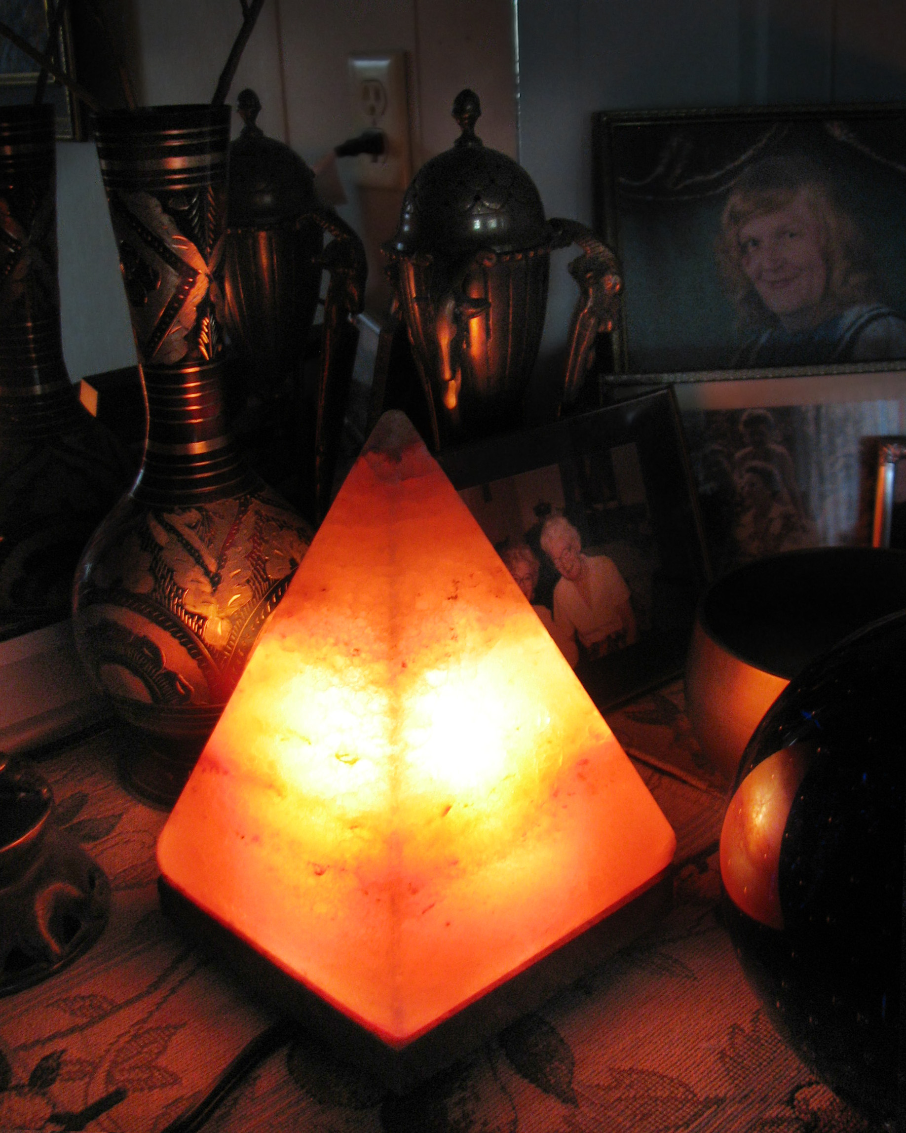 A salt lamp casts a warm orange glow in our area of photos of loved ones who have passed on.