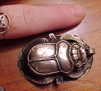 Later last night, while perusing articles archived from Ancient Egypt Magazine, I came across a story on Egypt's Gold Country and the modern day jewelers who work with gold. "The two methods the ancient Egyptians used to bond gold together were welding and soldering." The modern craftsmen also use these techniques, for as I examine my silver and gold scarabs, I see they are each made of two layers of metal welded together.