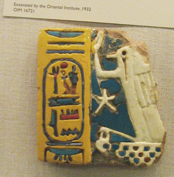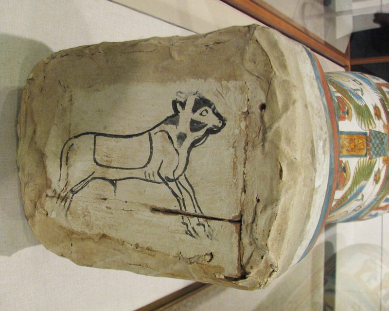 The relief with Set was not in evidence, however, I found a small piece featuring Panehmy who has his arms outstretched to Set in form of hippopotamus. Some colorful glazed fragments attracted me. Meresamun, the mummy who was scanned, is no longer upright, but I noticed the feet detail of a cow. Her case is a lovely piece, full of color and detail: |