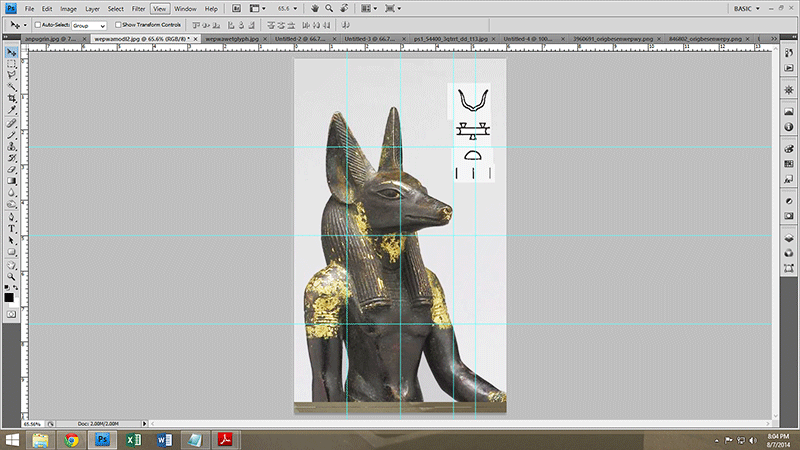 ![]() For the glyphs, I consulted various sources, including Per-Sabu's photos of various images of Wepwawet. There's some variance to the glyphs used, but I went with the ones in George Hart's "Egyptian Gods", and the example of vertical placement on the cartonnage of Nespanetjernpare at the Brooklyn Museum as captured at Per Sabu. |