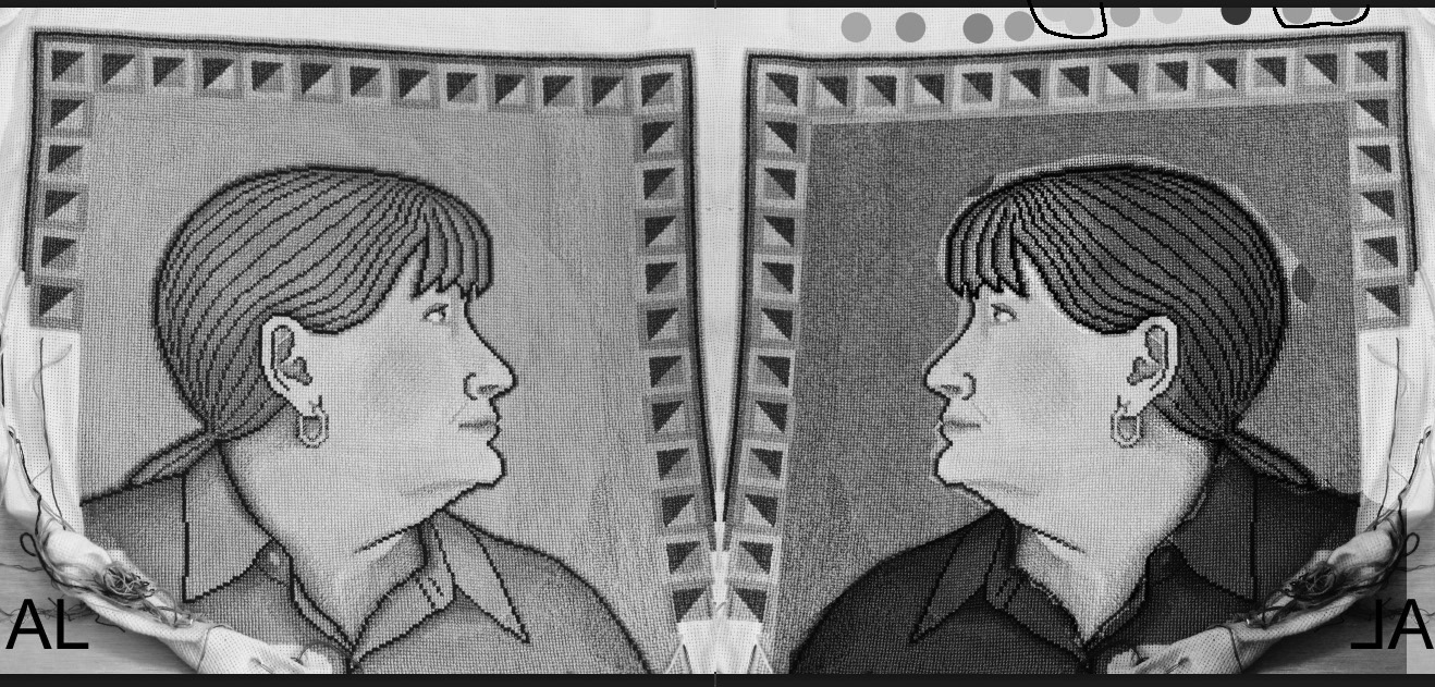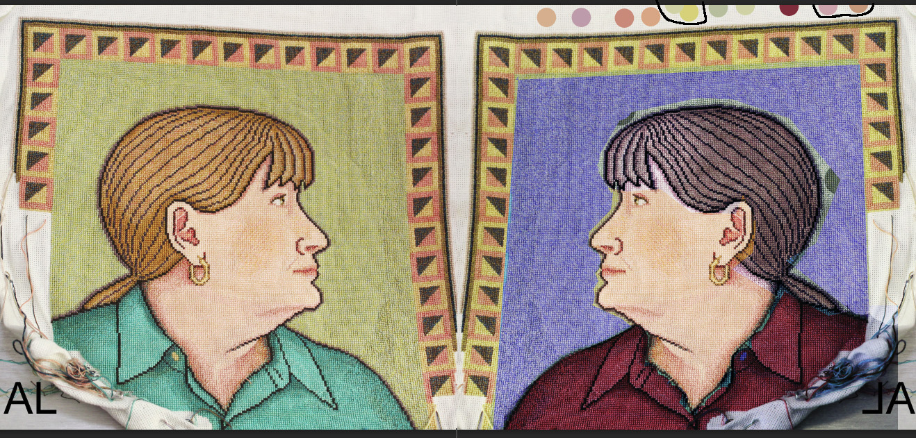 The purple background is a 180 degree hue shift (using Photoshop's "Hue/Saturation" tool) of my greenish background, (to be 'opposite, but complimentary'). The maroon garment color is a darkened version of the muted dark pink that happened with the original 180 degree color shift. Maroon is one of Julia's favorite colors (as the deep turquoise is mine), so again, there is the 'opposite, but complimentary' effect going on. Her border is a only slightly color shifted version of my border. In this shift, the gold turns more greenish, which echoes better with my green background. (See left color sampling pair.) The light tone of this greenish color echoes the light skin tone. That color shift also made the pink part of the border more cool toned, and more similar to the cool tones of the dress color. (See right color sampling pair, the lightened dress maroon beside the pink border sample.)