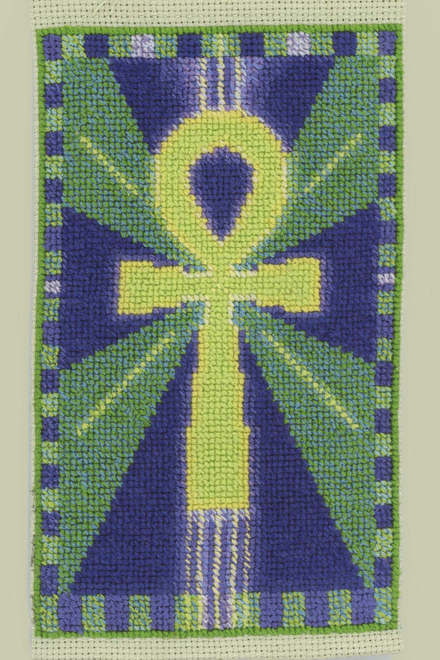 Back to my stitching efforts... I felt the temptation to do one more of the 'radiant ankhs'. The new design challenge was adapting the design to a smaller size. The size changes on the others in the series were done solely by change of stitch count of the aida. This ankh end of 'arm' to end of 'arm' is 35 'pixels' wide, whereas all the others are 47 'pixels' arm to arm. I had to simplify some aspects of the design: