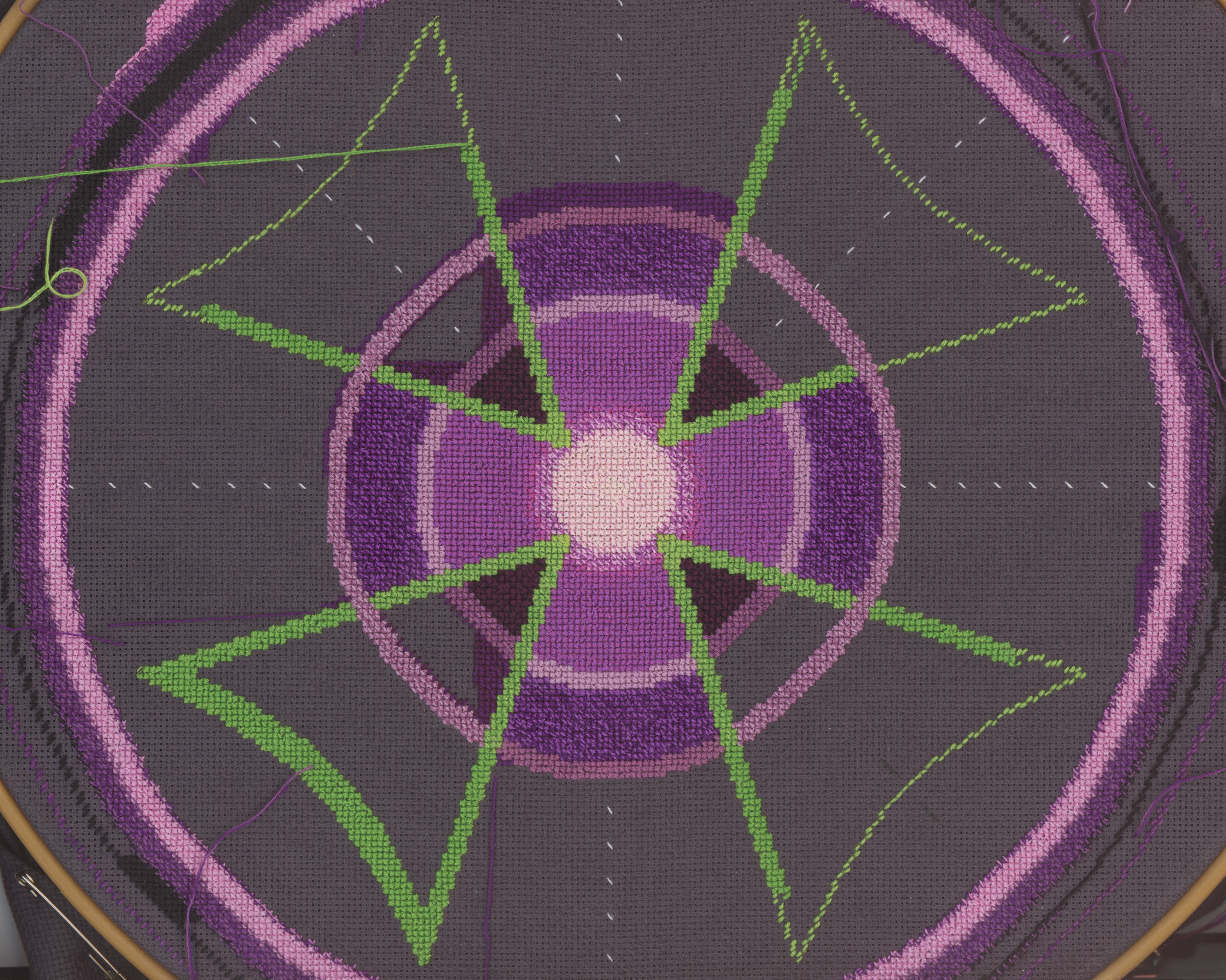 I will need to adjust the green triangle design area, as the triangles came out a slightly different shape. But the center circular part is well on its way to being done.