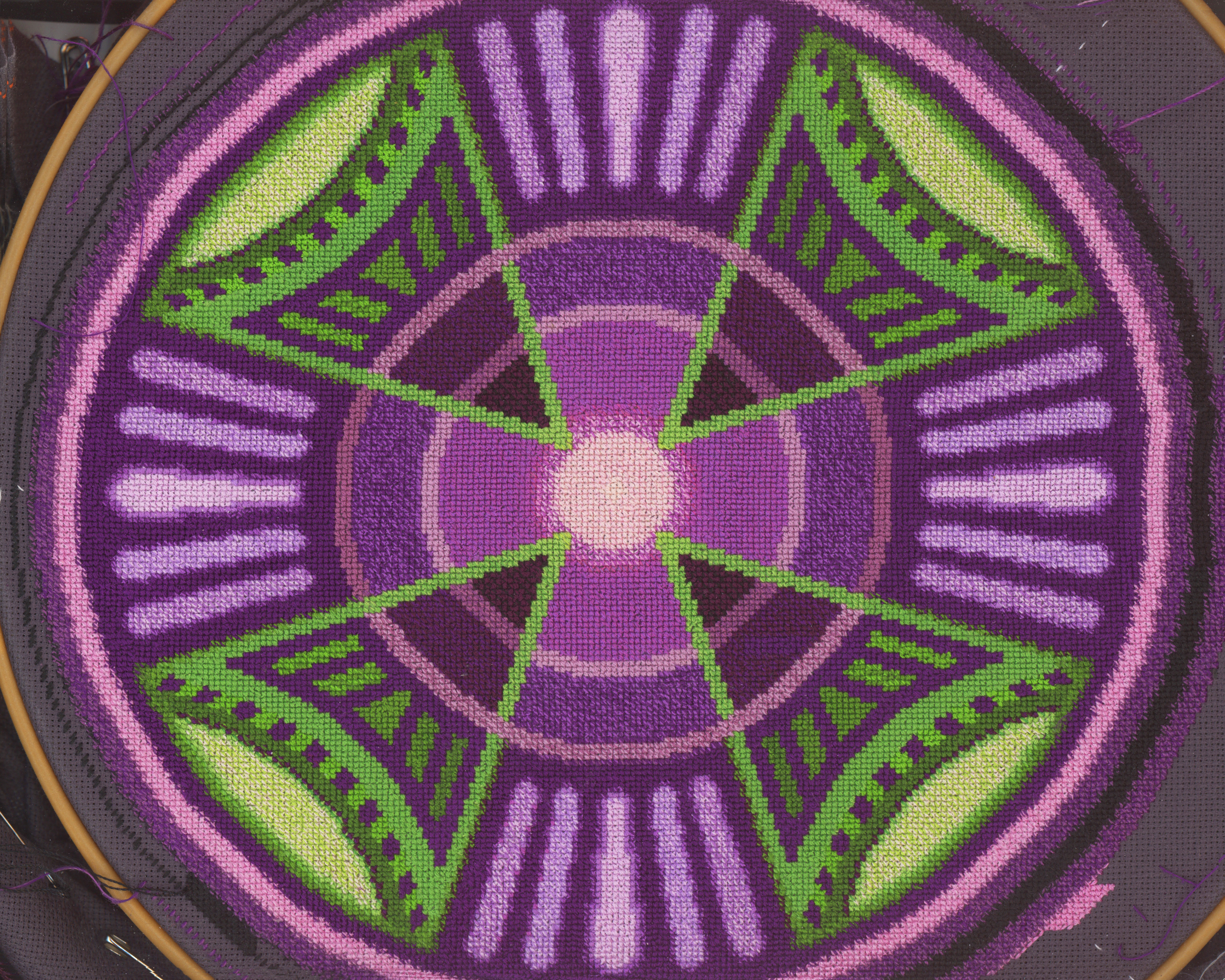 I'll finish the black circle and what I can of the outer purple. Then it's off the hoop, for more stitching.