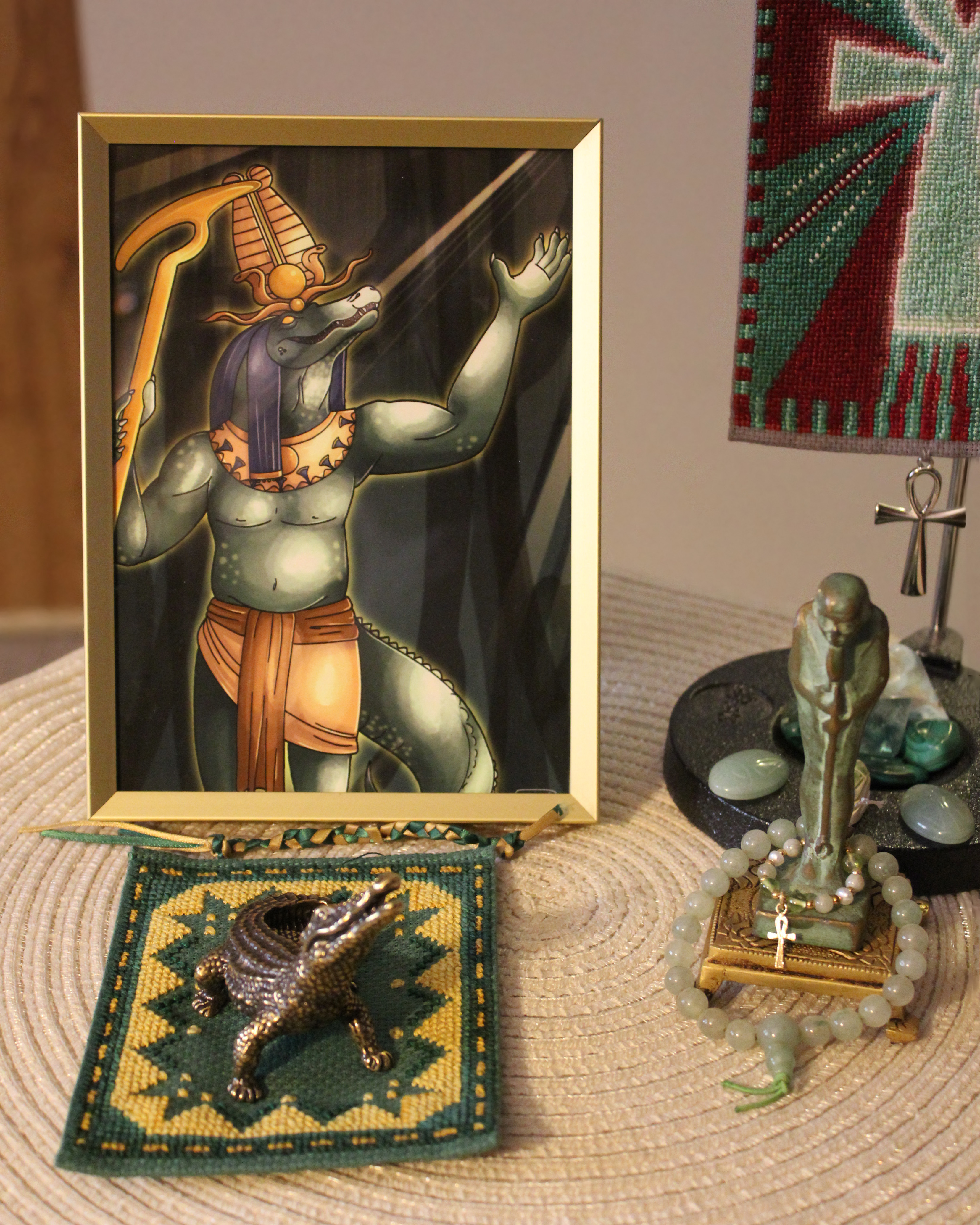 I got inspired for a little offering to Ptah-Sokar-Wesir. I noticed that the colors for Sobek-Ra's mat looked good with Ptah's statue: