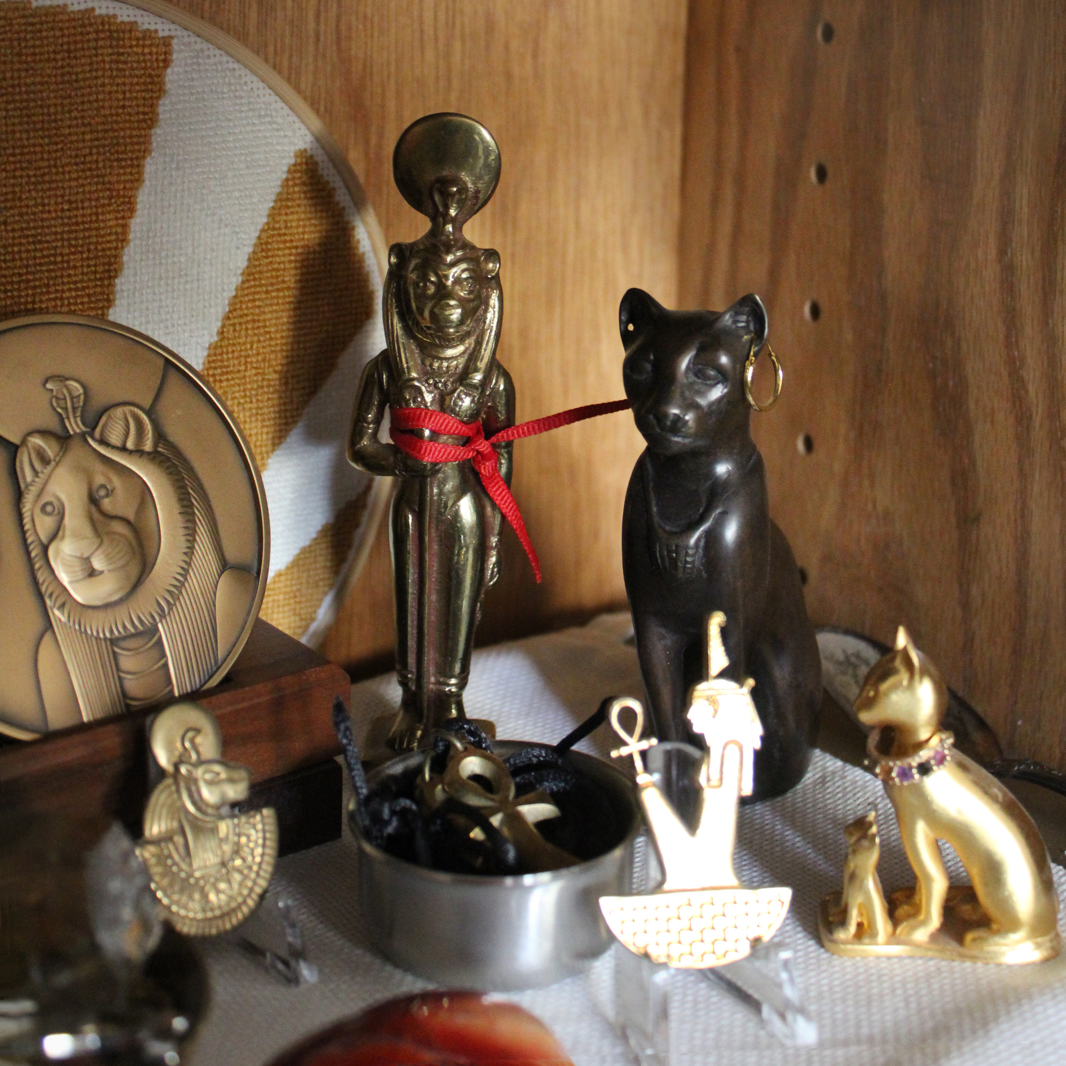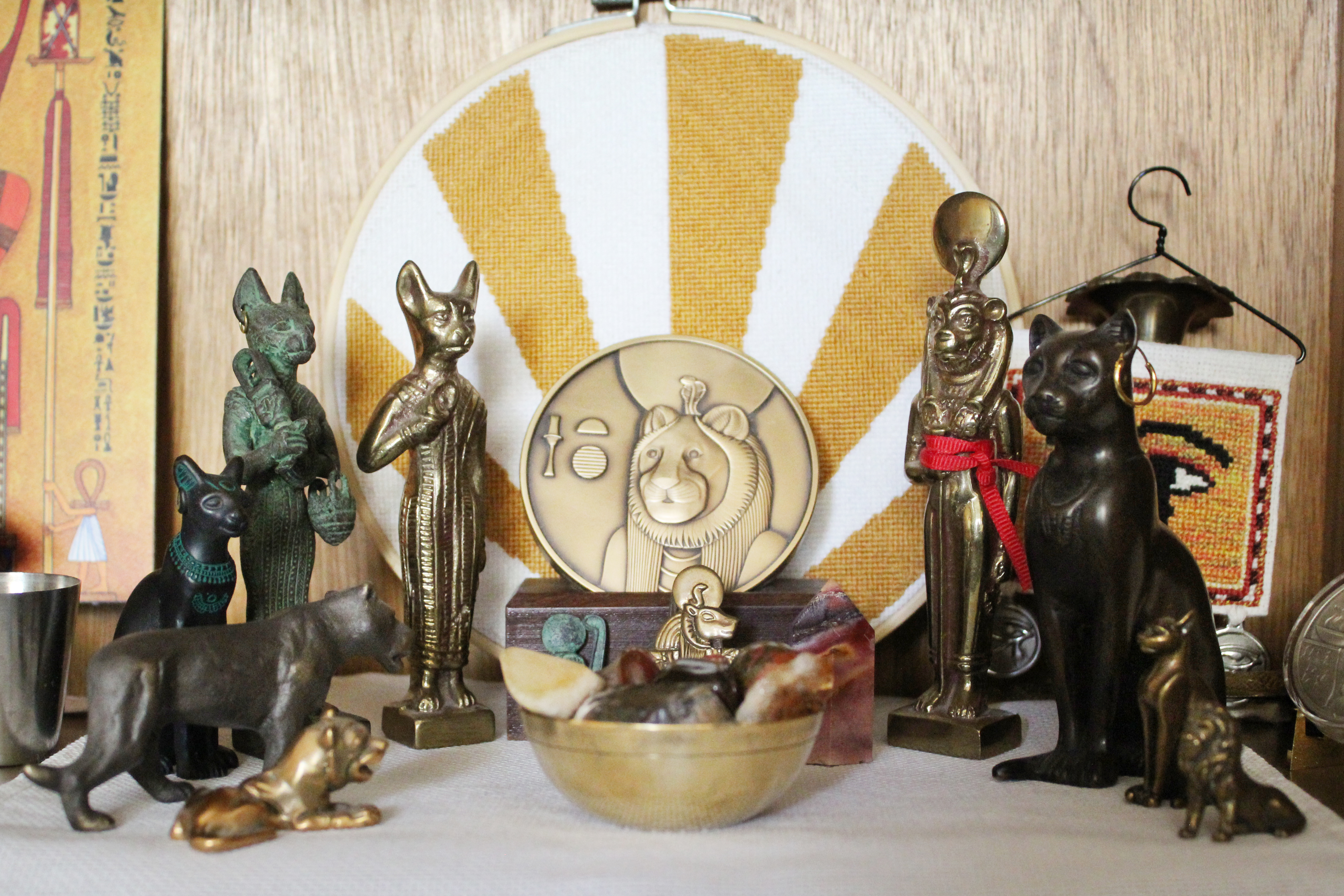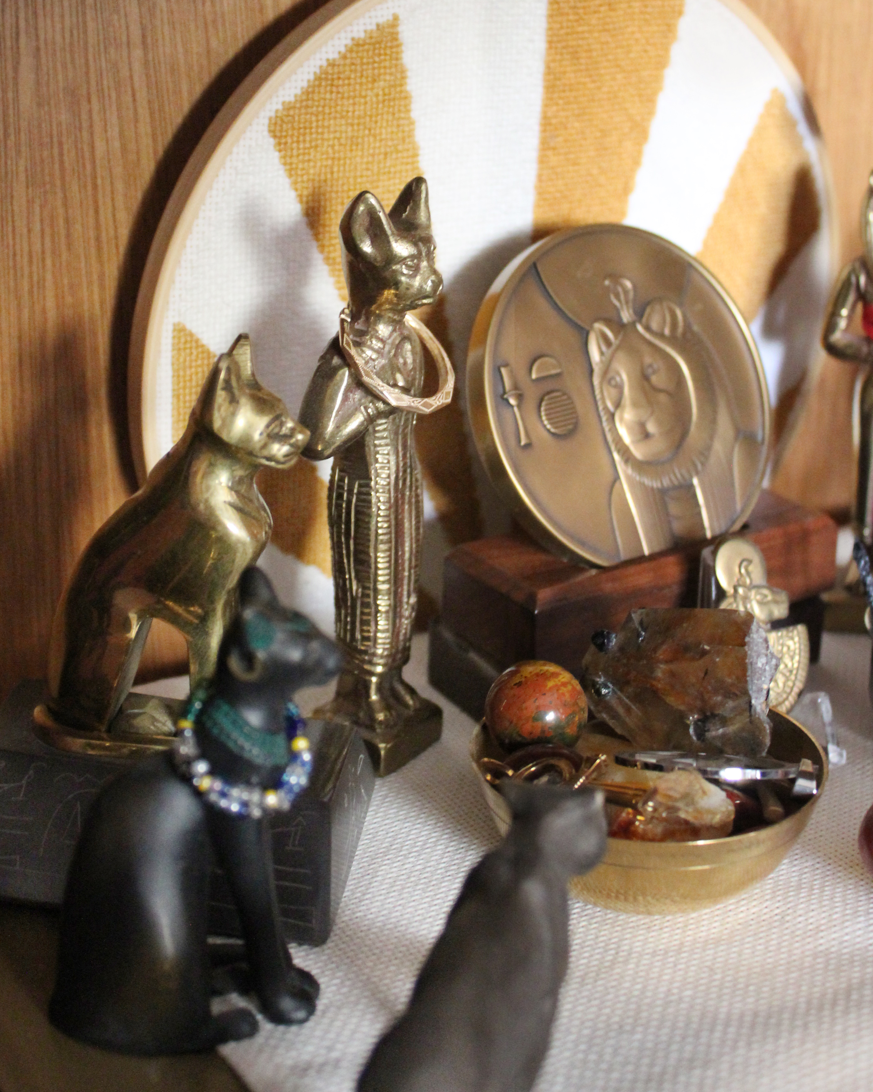 This shrine for the Eye of Ra was first created in 2020, with a simple design. It was moved to a different location in 2022. But over the next four years it kept growing and I don't know how I fit all the things I'd crammed into its little platform. Now a new statue inspired me to a reorganization: