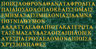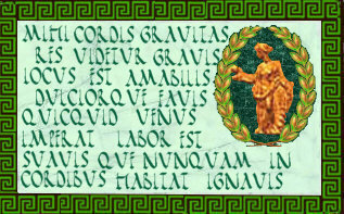TIBI AVSCVLTAMVS ET VENVS ALMA AMBAE TE OBSECRAMVS ARAM AMPLEXANTES HANC TVAM LACRVMANTES GENIBVS NIXAE IN CVSTODELAM NOS TVAM VT RECIPIAS ET TVTERE ILLAS SCELESTOS QVI TVOM FECERVNT FANVM PARVI FAC VT VLCISCARE NOSQVE VT HANC TVA PACE ARAM OBSIDERE PATIARE NE INVISAS HABEAS NEVE IDCIRCO NOBIS VITIO VORTAS MINVS QVOD BENE ESSE LAVTVM TV ARBITRARE |